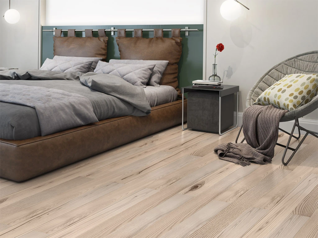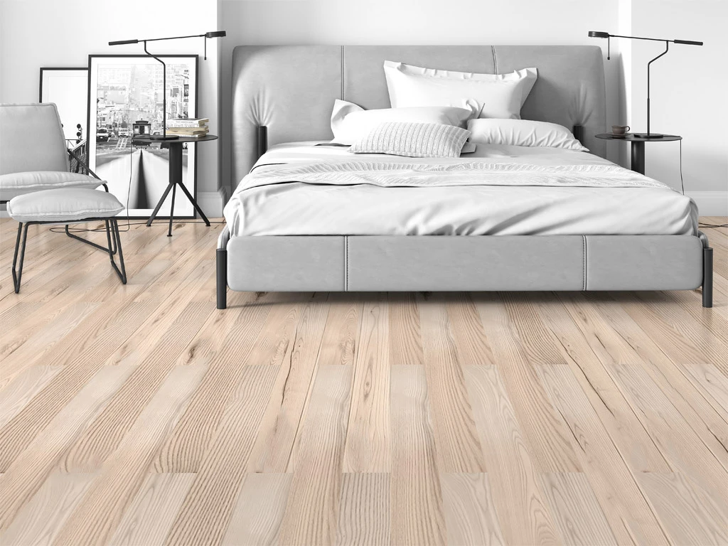 Ces lames en frêne possèdent une veinure attrayante et vivante qui crée une ambiance vivante et unique. Grâce à sa grande résistance statique et dynamique, ce sol est relativement peu sensible aux chocs et aux pressions.