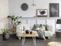 Ce produit est équipé d’un panneau support résistante à l’eau et est donc parfaitement protégé contre l’humidité. Ce revêtement de sol peut donc être posé sans problème dans les pièces humides comme la cuisine ou la salle de bains. La pose au-dessus d’un chauffage par le sol à eau chaude n’est pas un problème.