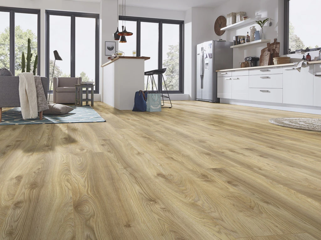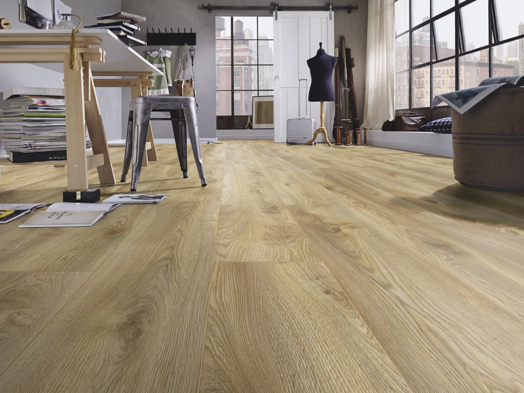 Ce stratifié de classe d’usage 23 convient dans le domaine privé pour les surfaces fortement sollicitées comme les cuisines, les couloirs d’escalier ou les entrées. Sa classe d’usage (CU) 33 prédestine cette lame de stratifié également à un usage commercial intensif, comme dans les grands magasins, les halls ou les salles de classe.