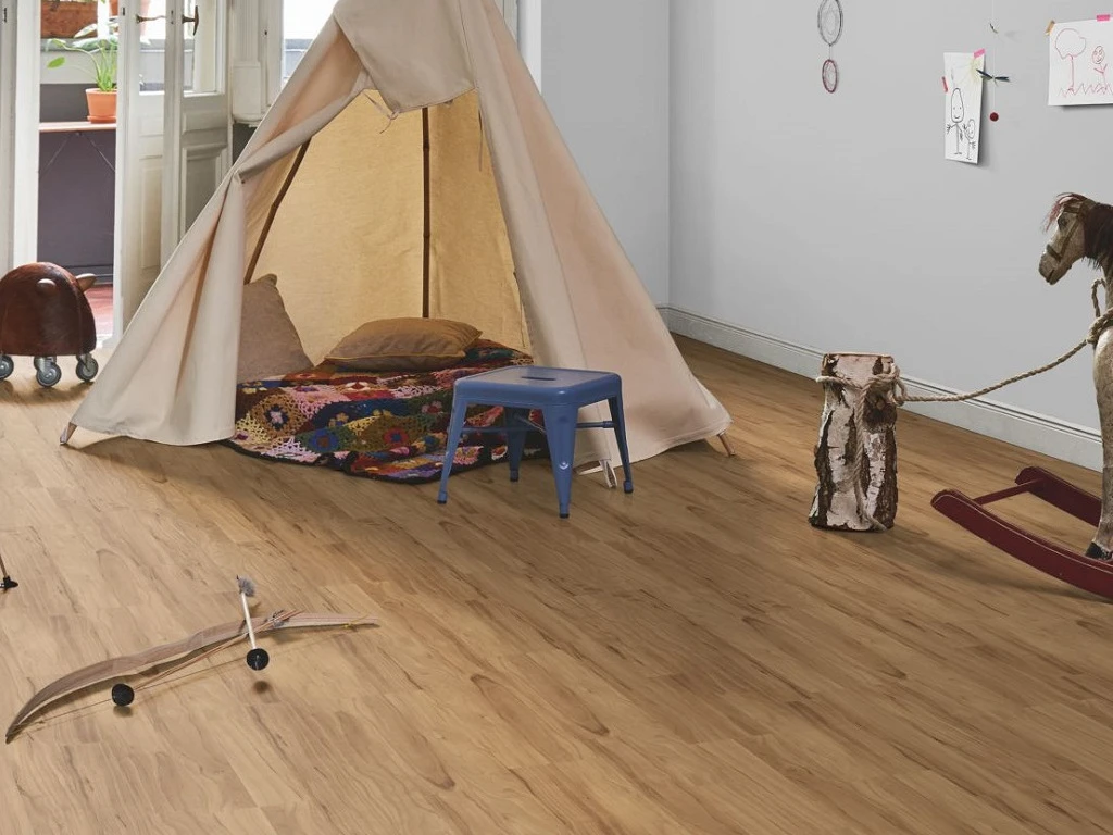 L’épaisseur du stratifié est de 8 mm – ce qui correspond à une utilisation légère dans le domaine commercial. Grâce à l’assemblage par clic Safe-Lock PRO, le sol peut être posé de manière flottante sans aucun problème.