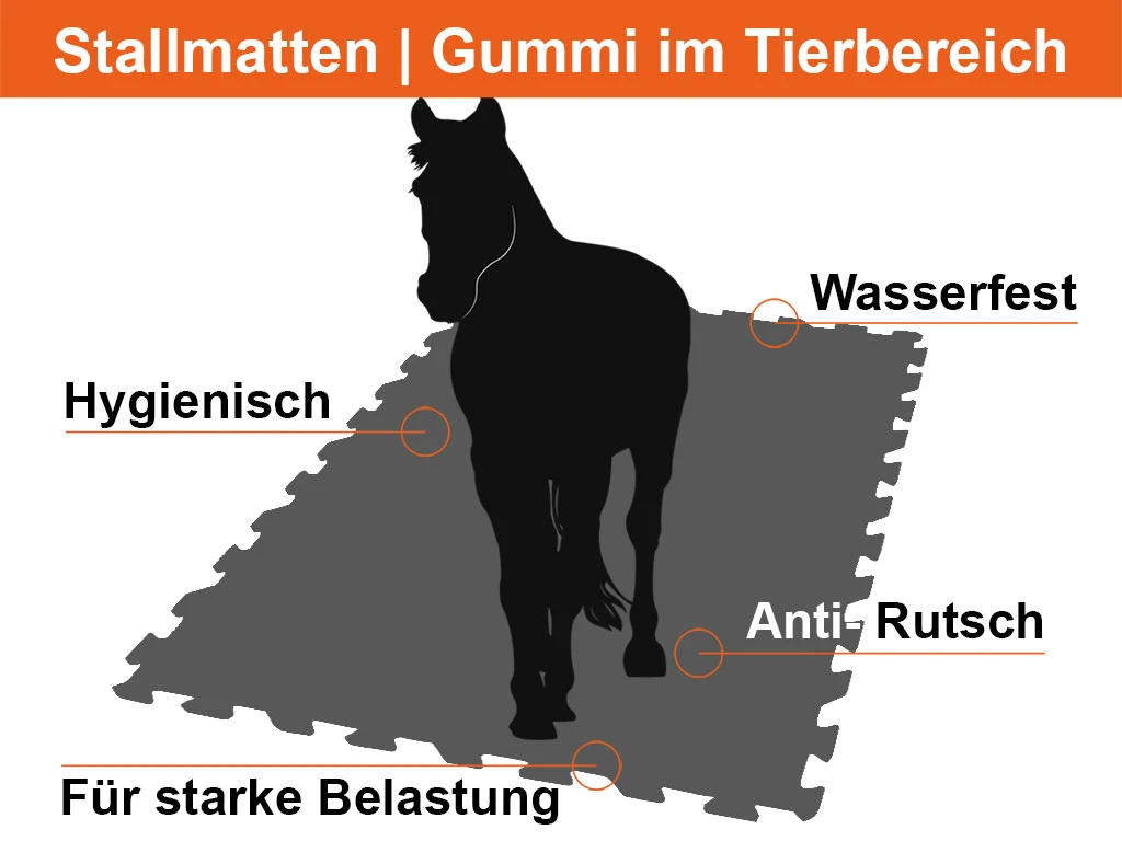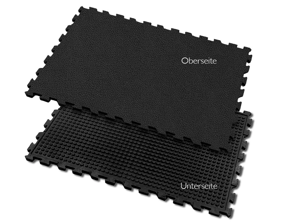 Robuste et résistant, il convient à tous les types de sols et à tous les types d’élevage. Sa forme et sa structure particulières confèrent au tapis un effet d’amortissement et de suspension. La surface antidérapante est facile à nettoyer. L’eau, les températures extrêmes et la saleté ne l’affectent pas. Le système de connexion pratique permet de couvrir une surface aussi grande que vous le souhaitez. Les dalles en caoutchouc peuvent être posées de manière flottante et ne nécessitent pas de fixation sur le support. Le poids de 17 kg du tapis et la précision de l’assemblage créent une surface stable.